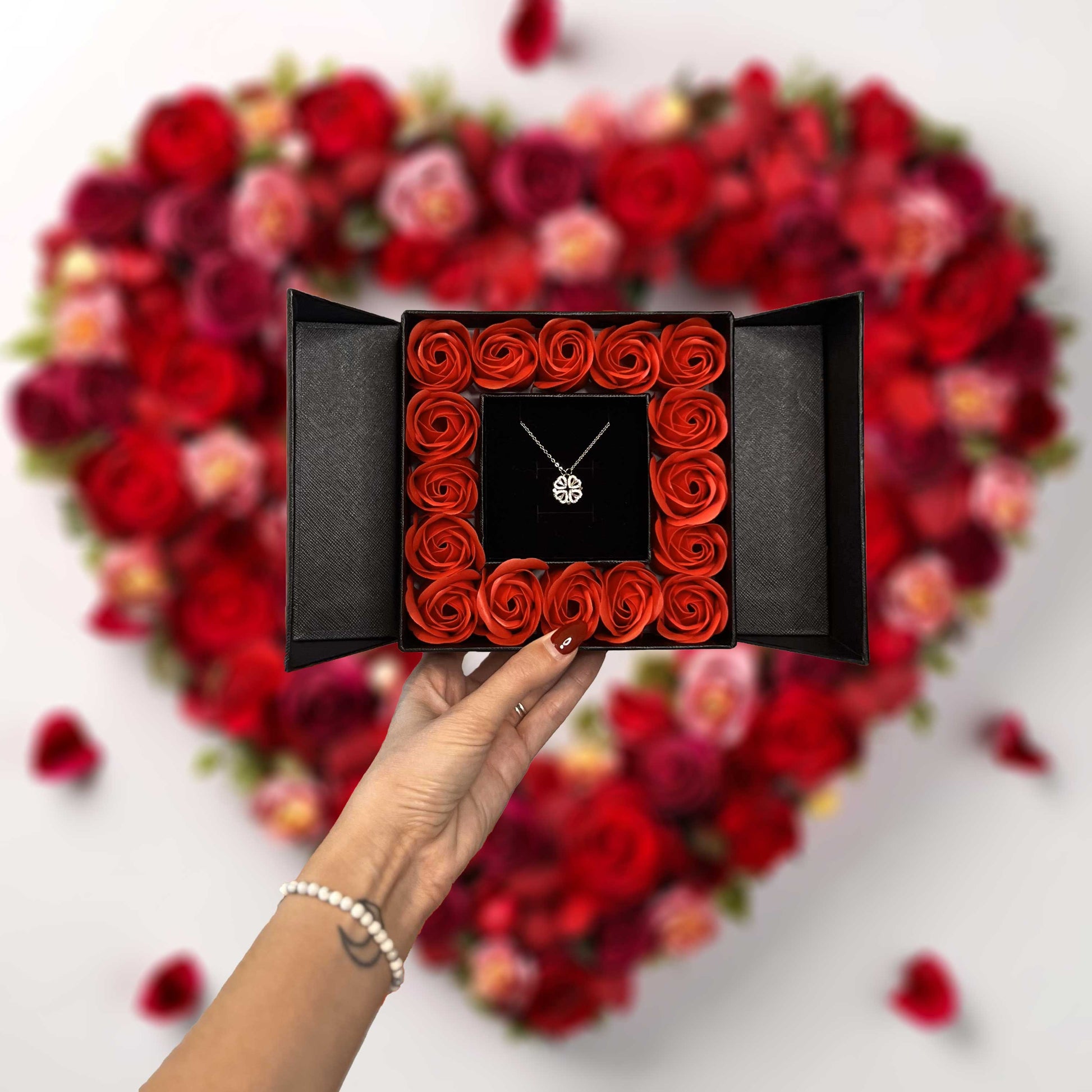 Die Kette kann auf zwei Arten getragen werden: als Glücksklee oder vier romantische Herzen. Der Anhänger verbindet die Herzen magnetisch mit dem Kleeblatt.